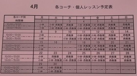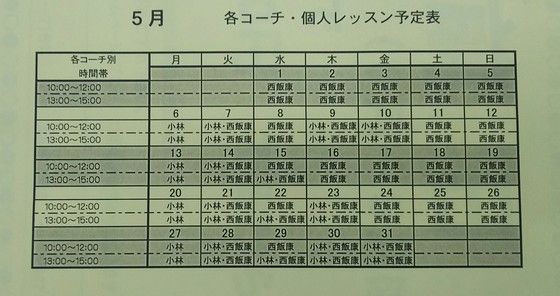20195月30 6月個人レッスン予定表&小林コーチ前日割 《個人レッスン情報》 西飯スポーツでは、 個人レッスンのご予約 を受付中です。 (お友達とのグループでも可能です!) 下記の日程表をご覧いただき、希望の日時を 前日までに ご予約下さい。 ※ ご予約約は先着順 となります。 ※ 当日のご予約 は受付ておりません。 個人レッスンの料金(チケット)は、西飯スポーツ店でお買い求め下さい。 (レッスン料金には練習場の使用料込みの価格となります。) 小林仁 コーチ (こばやし ひとし) 現役時代は全日本混合ダブルス優勝経験あり。現在は西飯スポーツの社長です。 30分につき 2,500円 小林コーチ はお得な回数券 もございます。 只今キャンペーン中で 30分につき”500円引き” です。 ぜひ一度レッスンを受けてみてはいかがですか? ※小林コーチは、学生の受付はしておりません。 小林コーチ前日割がご好評につき、6月7月も限定で行います! ※ご希望の前日に予約したのが対象となります。 西飯康幸 コーチ (にしい やすゆき) 30分につき 1,000円 45分につき 1,500円 (※5月は土日祝は、1人60分までとさせていただきます。) ※西飯コーチは日曜日のみ、17時まで受付中です。 各コーチの名前がある日がレッスン予約可能となります。 ※ご予約は希望の日の前日までにお願い致します。 当日のご予約は受け付けておりません。 お問い合わせ等は 卓球専門店 ㈲西飯スポーツ 〒510-0244 三重県鈴鹿市白子町69-9 Tel 059-386-7161 Fax 059-386-7159 営業時間 9:30 ~ 19:30 定休日 月曜日 タグ :#卓球