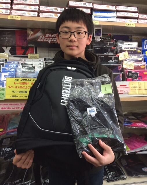 201912月25 お楽しみガチャガチャ抽選会 おめでとうございます!!なんと本日特賞と一等賞が同時にでました! 出る時は出るもんですね~。特賞はバタフライのリュック一等賞は JUICのTシャツをそれぞれチョイスしていただいた後、思わずお写真を撮らせていただきました。ご来店、お買い上げありがとうございました!★ガチャガチャ抽選会まだまだ豪華な賞品あります ★★是非この機会にお越し下さいませ★ タグ :#卓球#西飯スポーツ